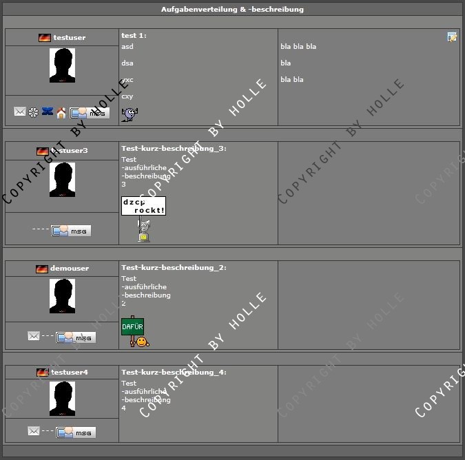 Nachdem mich meine Member mehrmals darauf angesprochen haben, wo & wie man denn einen Admin oder Zuständigen für einen bestimmten Bereich im Clan erreichen kann, bin ich auf die Idee gekommen, diese Übersicht dazu zu coden.