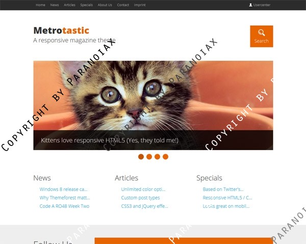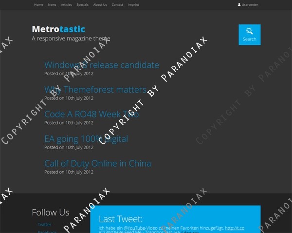 Metrotastic is a responsive HTML5 / CSS3 Theme for WordPress. It is based on Twitter’s Bootstrap Framework – Enhanced with jQuery and custom post types. It’s designed with online magazines in mind and comes with a light and dark color scheme and unlimited color options. It looks fantastic on mobile devices, is easy to setup and has some amazing CSS3 and jQuery effects. Everything right out of the box. So what are you waiting for?